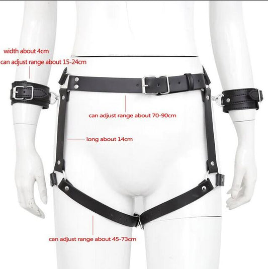 Slave PU Leather Harness with Handcuffs Erotic Waistband Garter Belt