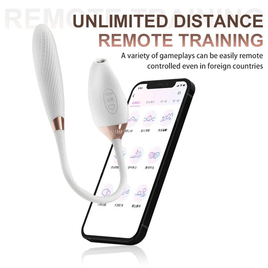 App Controlled Suction Vibrator with Thrusting Warming Dildo